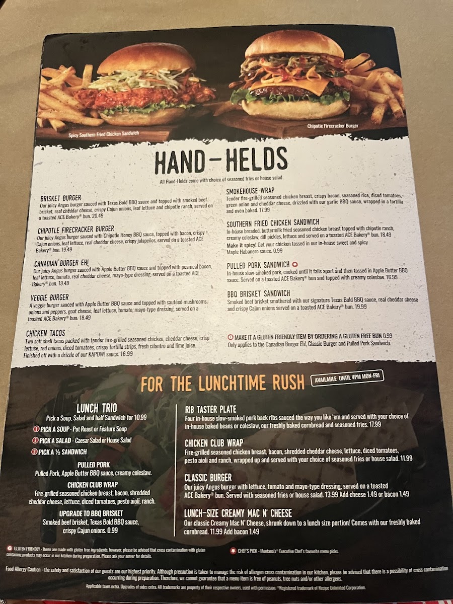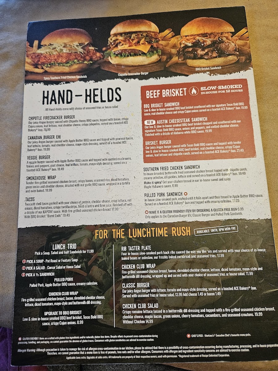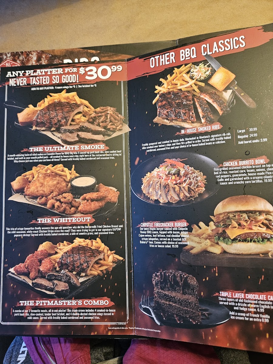 We ended up unable to choose between Montana's and the neighboring Jack Astors, a coin flip was the deciding factor, and we were definitely not disappointed. The BBQ brisket sandwhich was so good; it was tender, they give you a great amount of brisket and they give you perfect amount of BBQ sauce ensuring you can taste everything it has to offer. My partner had the Honkin' Beef Rib which he said was phenomenal, the baked beans especially so. The host and waitress were both very friendly, the atmosphere was lovely and the menu had such a great selection to choose from!